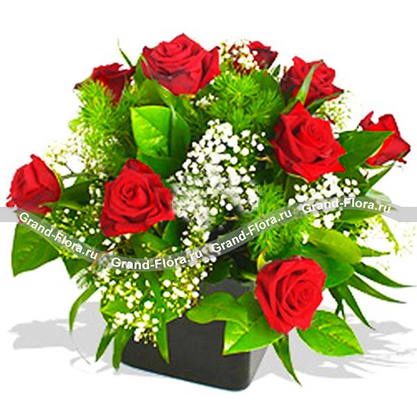 Стандартный: розы красные  - 7 шт., гипсофила - 4 шт., декоративная зелень, оазис.
