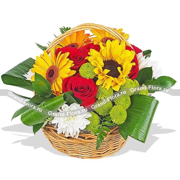Уменьшенный: роза красная - 3 шт, гербера желтая - 1 шт, подсолнух - 1 шт, хризантема кустовая зеленая - 1 шт, хризантема кустовая белая - 1 шт, лист аспидистры - 3 шт, рускус, оазис, корзина.