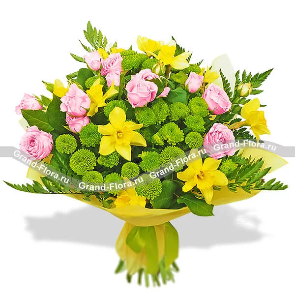 ДЕЛЮКС: роза кустовая розовая - 5 шт, хризантема кустовая зеленая (сантини) - 5 шт, нарциссы - 7 шт, декоративная зелень, фетр желтый.