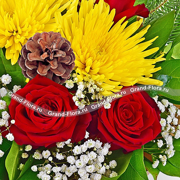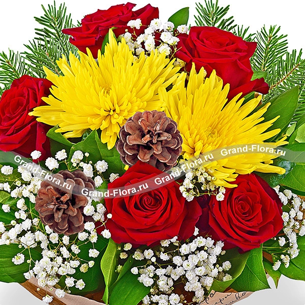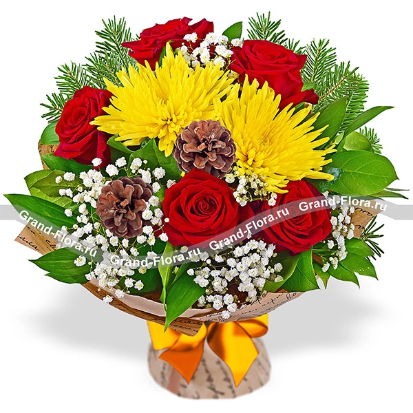 Стандартный: роза красная - 5 шт., хризантема одноголовая желтая - 2 шт., гипсофила - 2 шт., ель , шишки - 2 шт., рускус - 2 шт., упаковка крафт, лента желтая.