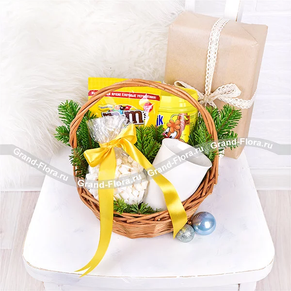 Стандартный: кружка - 1 шт., какао "Несквик" - 250 г., шоколад "M&M's" - 240г., маршмеллоу - 100 г., ель., корзина малая.